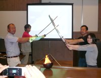 Kessen_katana石川県チームと富山県チームの代表が刀を交えて合戦開始の儀。左の富山チームはレスター@清水さん、タニハタ@谷端さん、右の石川チームはのコルク屋本舗@坂下さん、カネイシ@新谷さん。
