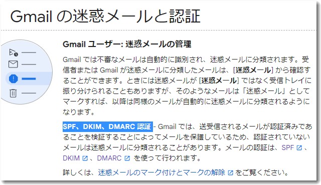 上記のGmailヘルプには、迷惑メールの管理には、SPF(エスピーエフ)、DKIM(ディーキム)、DMARC(ディーマーク)、の認証が重要であることが書かれています。
