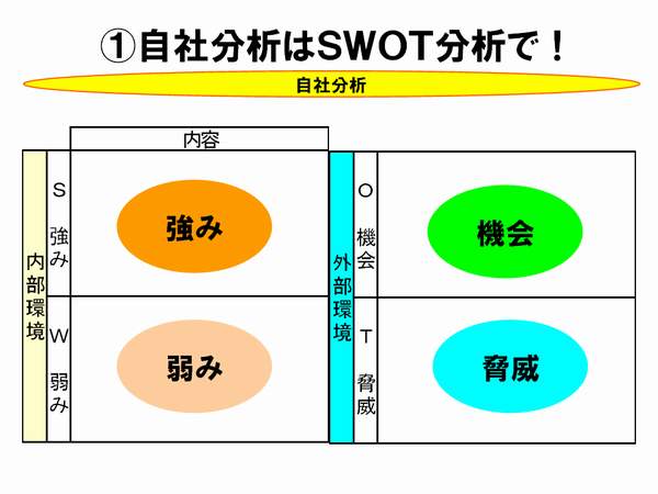 Swotgassyukuikenkoukan泊り込みで自社のSWOT分析する経営合宿。SWOT分析とは、S:強み、W:弱み、O:機会、T:脅威という4つの象限で自社の現状を分析する経営分析ツールである。自社を取り巻く経営環境を内部要因の強みと弱み、外部環境の機会と脅威にわけて列挙し整理する。