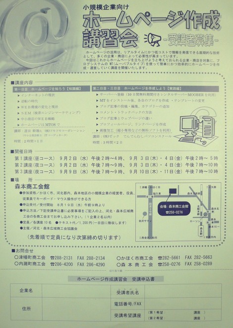 森本商工会でホームページ作成講習会の第一講座の1回目と第二の1回目が9月2日の午後と夜に開かれた。講座は同じ内容のものを3回にわけて開催され、それぞれ3回行われるため合計9回開催される。第一講座から第三講座までの1回目の講師は遠田幹雄が努める。なお2回目と3回目はMT(ムーバブルタイプ)を使った実際の投稿などの演習で、講師はゼックの道上さんが努める予定になっている。