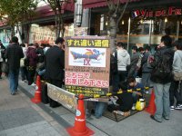 日曜日の秋葉原。DS持参でヨドバシカメラの前に集まる人たちが多数いる。看板には「すれ違い通信」「ドラゴンクエスト9」「ルイーダの酒場」と書いてある。ここは屋外のルイーダの酒場。ドラクエ9のすれ違い通信で情報交換をしに来る人たちの社交場となっている。レアな宝の地図が人気のようだ。