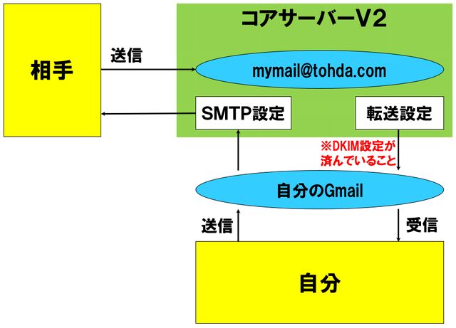 すると、その送信メールはGmailからコアサーバーV2のメールサーバーに送信されます。そのメールがGmailに転送されることで、ご自身のGmailにて受信できるはずです。