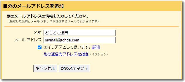 名前とメールアドレスを入力し、「エイリアスとして扱います」にはチェックを入れておきます。