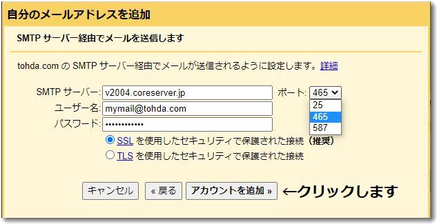 なお、ポート番号は「465」を選択します。すると自動的に「SSLを使用したセキュリティで保護された接続」というラジオボタンに●がつくはずです。