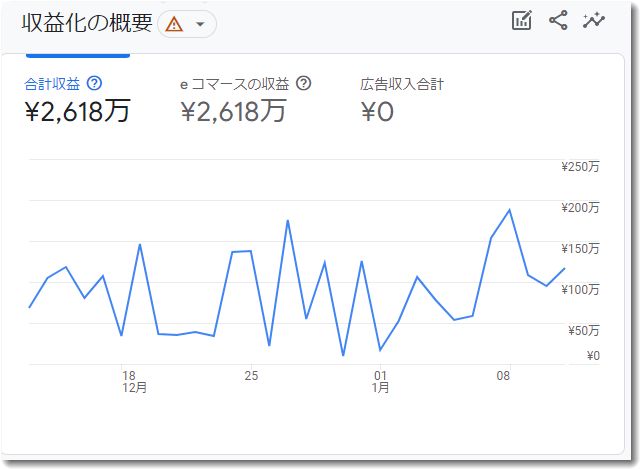 また、売上金額も分析できます。GA4のメニューから、「収益化」→「収益化の概要」で、通販サイトの売上を分析することができます。