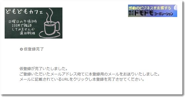 上記は、どもどもカフェ専用メルマガの仮登録完了の画面です。