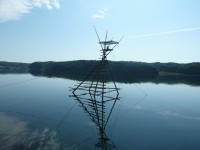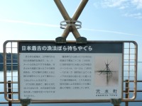 ボラ待ちやぐらの説明看板ボラ待ちやぐらの漁法は1996年を最後に、現在は行われていない。今は、そのやぐらは象徴的に展示されている。