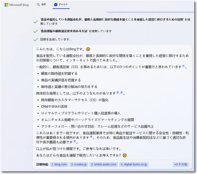 一方、新BINのチャットは、回答を生成するさいの出展情報URLを明示してくれるので、そのままリンク先をクリックして情報を確認することができます。また、やりとりがより人間的で自然な印象があります。