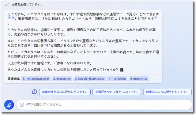 回答してくれた内容の次に、3択の質問の選択肢が現れることがあります。そのひとつをクリックするだけで、その質問に関する回答が生成されます。