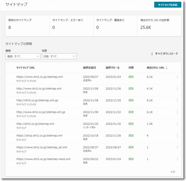 上記の画像は、BINGウェブマスターツールに登録されている当社サイトのサイトマップの一覧です。このように記録されているということです。