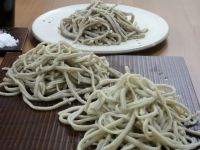 しかし、2種以上を食べ比べるなら細挽き蕎麦も頼むといい。香りも味わいもすばらしいからだ。店主の佐野氏によると今年の丸岡産の蕎麦はできがいいらしく、とくに香りが際立って出色とのことだ。たしかに細挽き蕎麦の香りはずば抜けていい。細挽き蕎麦の香りとあばさけ蕎麦のあじわいを両方味わうことで佐野蕎麦の蕎麦に対する思いがわかる。そして最初の一口はぜひとも「だしなし」で食べてみるといい。塩で味わうもの佐野蕎麦の楽しみかたのひとつ。