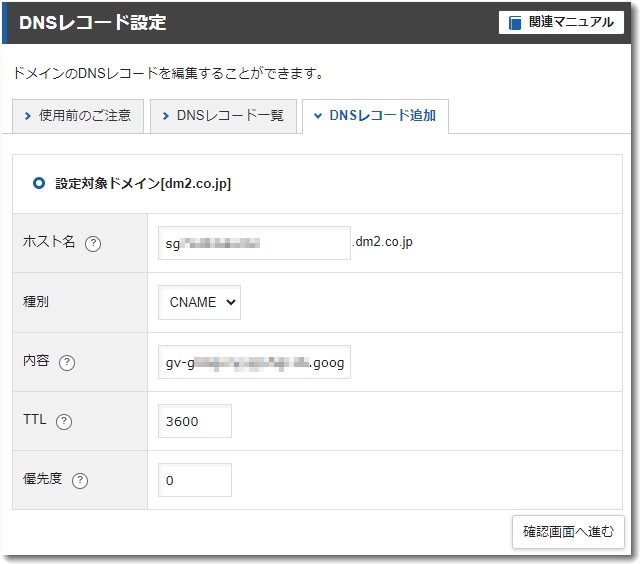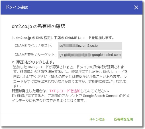 CNAME 宛先 / ターゲット: gv-g**************.googlehosted.com
