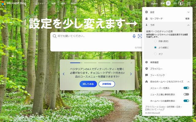 新BINGが優秀なのでGoogle検索をだんだん使わなくなってきている今日このごろの私です。新BINGを使うのは主にAI自動生成の「チャット」なのですが、検索画面でも連動してチャットが稼働します。このチャット稼働頻度を「より頻繁に」に変更すると、ほとんどの検索結果画面でチャットが応答してくれるので検索が楽しくなります。