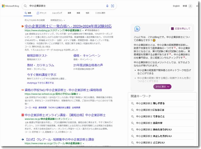 まず「中小企業診断士」という検索キーワードを入れてみました。検索結果画面の右側にチャットの応答が表示されます。「さらに表示」をクリックすると、さらに回答が続き、その後に三択の質問候補が表示されるので答えていくと延々とやりとりが続きますので深掘りが容易です。