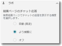 右上の三本線(ハンバーガーメニュー)をクリックし、「ラボ」をクリックすると設定を変更できます。「結果ページのチャット応答」というところで、「より頻繁に」に設定しておくと便利です。ほとんどの検索結果画面でAIチャットが応答してくれます。