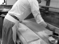 Sobauchi腕のいい蕎麦打ち職人は手元がきれいだし、手際もよい。蕎麦打ちのあとの麺体を切る作業工程を見学させてもらった。リズミカルに包丁で蕎麦を切る作業は見ていても気持ちがよい。