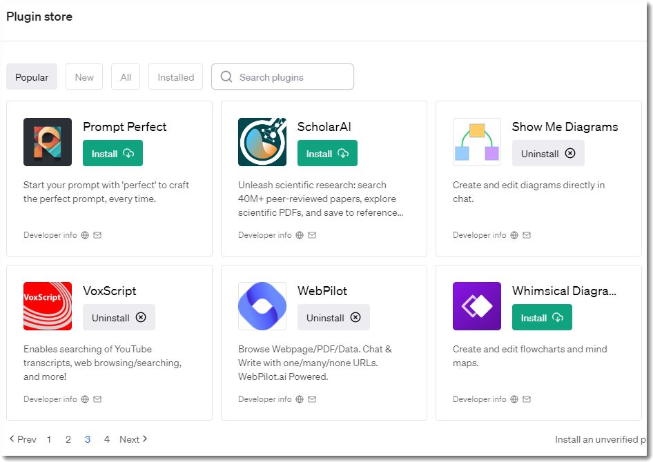 ChatGPT4の画面からプラグインストアを開き、使いたいプラグインを自由にインストールすることができます。