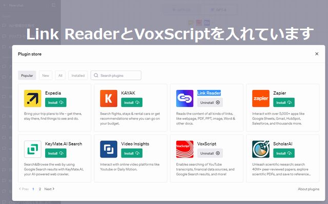 ChatGPTのプラグインで使えそうなやつはWEBからデータを取得する系で「VoxScript」「LinkReader」が便利です