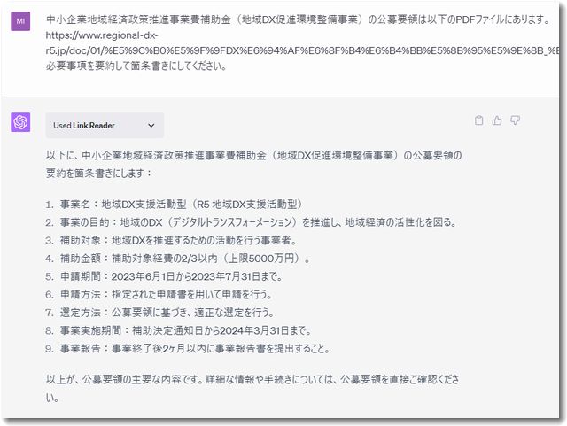例えば、経済産業省の「中小企業地域経済政策推進事業費補助金(地域DX促進環境整備事業)」の公募要領PDFを読み込んで、要約をしました。