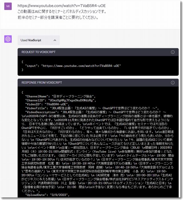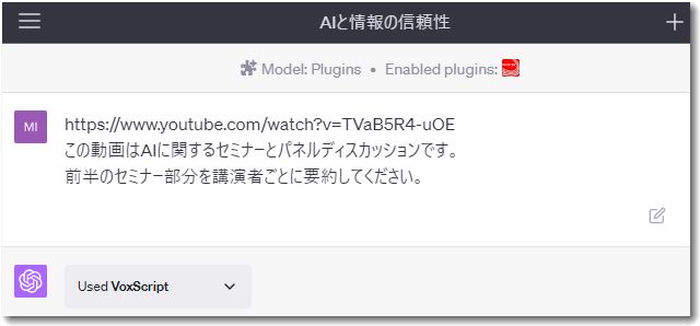 「VoxScript」はユーチューブ動画の字幕を読み込むためのプラグインです。「VoxScript」を有効にすると、読み込みたいユーチューブ動画URLから字幕データを読み取ったうえでその内容を文脈として把握して回答してくれます。