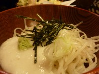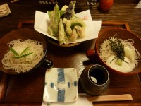 注文したのは「ふたみそば」。ふたみそばはおろしそばととろろそばと天ぷらのセットである。ベジタリアンの遠田は「天ぷらのエビを抜いて欲しい」とリクエストしたら野菜に変更してくれた。だしはかつお風味が感じられたが、別容器なので使わなかった。天ぷら用の塩があったので、その塩を使って蕎麦をいただいた。御前蕎麦は細いがコシが強く固めなので野菜天ぷらによく合う感じだ。