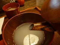 加賀上杉のそば湯はどろっとしていて、うすく塩味がつけてあるので、まずはそのまま飲んでみたほうがいい。だしを使わなくても十分においしいそば湯である。