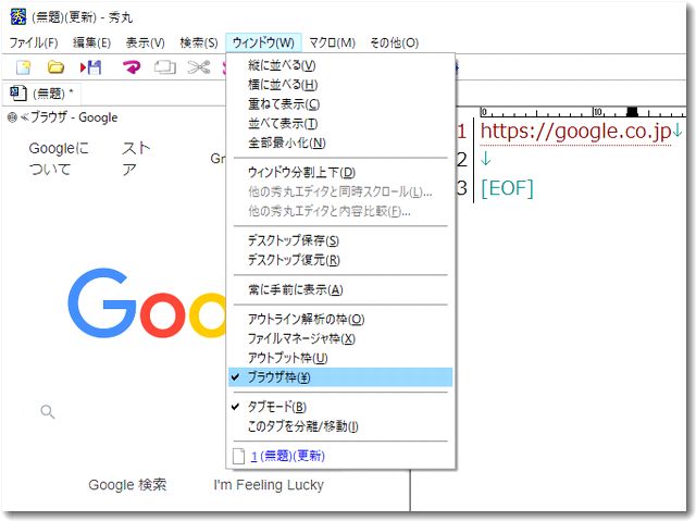 このように表示する方法は、秀丸のメニューで「ウインドウ(w)」を開き、「ブラウザ枠」にチェックを入れます。