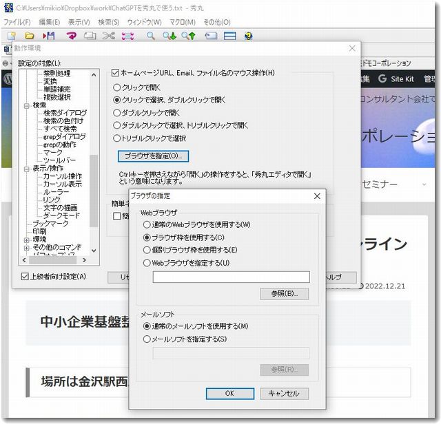 秀丸ブラウザ内で開くリンクを秀丸の「ブラウザ枠」に指定を変えました。これで秀丸エディタの中だけでワードプレスの編集作業を完結させることができます。