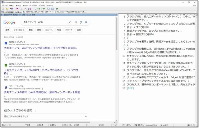 以下の画像は、左側にブラウザ枠、右側にエディタ枠を並べています。ブラウザ枠ではGoogleを開いて「秀丸エディタ WEB」という検索をした結果を表示したものです。このように左にブラウザ枠を開いて、右側にエディタを開いてメモを編集したりするような使い方ができるようになりました。