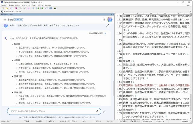 これはなかなか便利ですね。左側のブラウザ枠で質問しながら、その回答をもとに必要部分を右側のエディタ枠に記録していくことができます。動作もサクサクです。