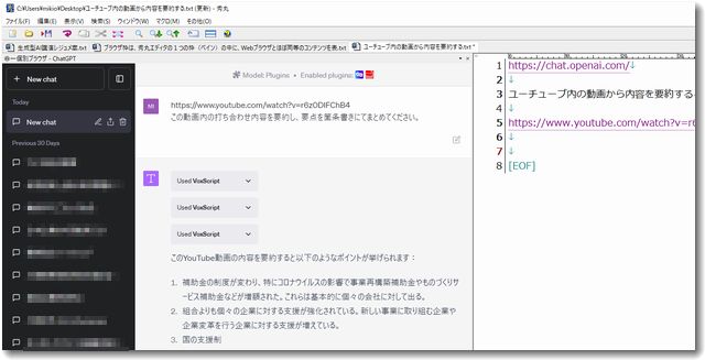 上記の画像は、秀丸エディタで「VoxScript」というプラグインを使ってユーチューブ動画の字幕を読み込んだうえで、内容を要約している様子です。この「VoxScript」というプラグインがとっても優秀で、読み込みたいユーチューブ動画URLから字幕データを読み取ったうえでその内容を文脈として把握して回答してくれるので重宝しています。