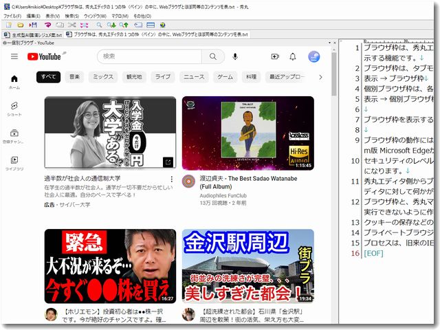 新・秀丸では、ブラウザ枠とエディタ枠を並べて表示することができます。
