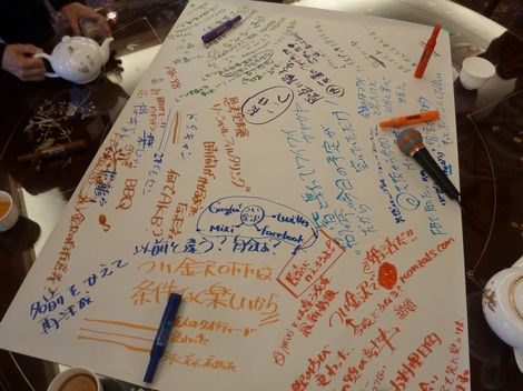 つい金沢1周年記念オフ会ではワールドカフェを開いた。ワールドカフェは始めてという方も多かったが、百万石ワールドカフェのメンバーの方々のサポートにより、楽しく意義ある交流ができた。お題は3つ。参加者は、それぞれ、お題ごとに旅をしてテーブルを移動しながら意見交換を楽しんだ。