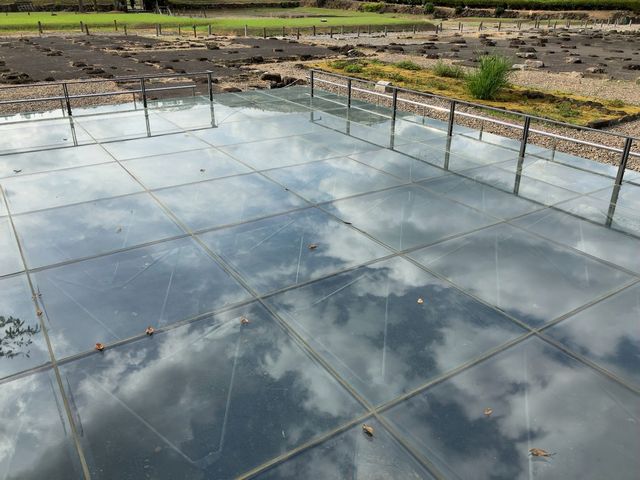 この歴史的な価値を保護し、同時に訪問者に視覚的に体験させるために、庭園では透明で強固なガラス板が使用されています。このガラス板は、土台や地面を直接見ることができるように設計されており、訪問者はまるで時間を超えてその場所の歴史を直接見ているかのような体験ができます。
