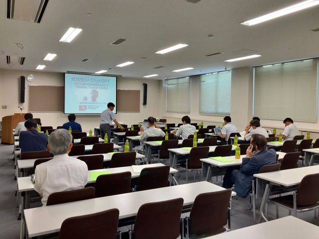 「対話型ChatGPTとは」というタイトルで生成AIについて講演させていただきました。会場は石川県地場産業振興センター本館の3階。この日は多数の会議や研修があるようで研修室はフル利用されていたような感じです。