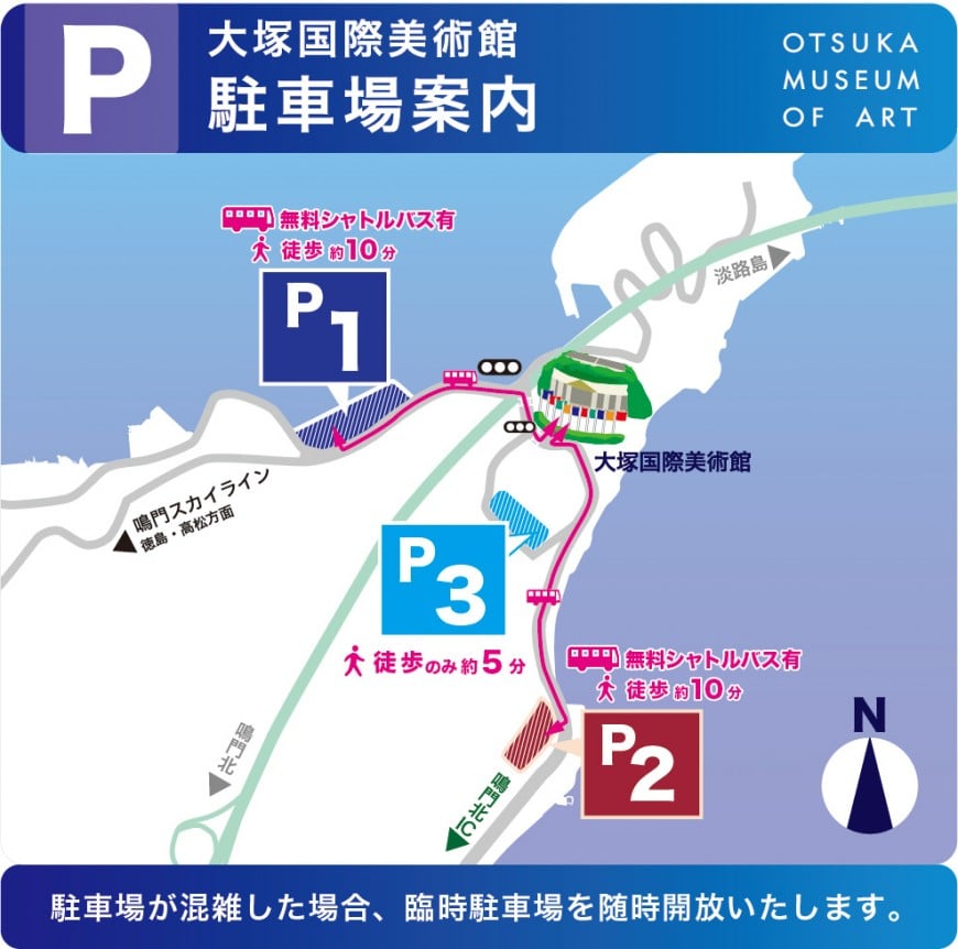 しかも駐車場がありません…。鳴門北インターから大塚国際美術館の前まで自家用車で来ましたが駐車場が近くに見当たらず、案内看板に従ってP1駐車場までたどり着きました。この間これでいいのかどうかとっても不安でした。