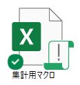 このマクロを集計したいエクセルに実装してマクロ実行可能なファイル形式(.xlsm)で保存します。拡張子が(.xlsx)ではなく(.xlsm)となっており、最後の一文字がマクロの(m)になっているのが特徴です。アイコンも変化します。