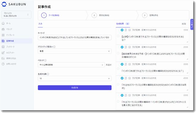 ・タイトル案は「外注フリーランス、インボイス制度、関係構築、ビジネスチャンス」などというキーワードだけを入れて案を生成する→10こ