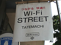 久しぶりにタテマチを歩いてみると、「Wi-Fi STREET TATEMACHI」という垂れ幕を多数見かけることができる。そこで、iPod touchの設定からWi-Fiを探してみると、たしかに多数のwifi電波が飛んでいた。