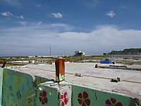 この一帯の回りの会社や民家もまったくなにも無い。家や工場だけではなく、多数の人名が失われた後だ。瓦礫は撤去してあるが、基礎が残っているだけ。その基礎やコンクリート土台に花のイラストが書いてある。あまりに悲惨だからということでボランティアたちが絵を書いたそうだ。自然災害の猛威と跡地に咲く花の美しさで胸が詰まった…。