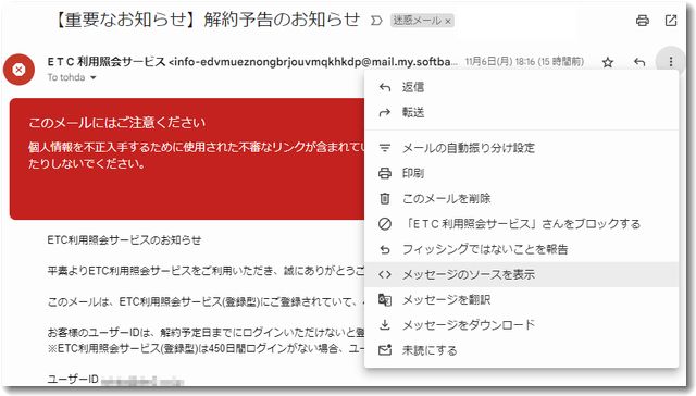 GmailではメールのHTMLソースを閲覧することができます。これはメールがどのように構成されているかを詳しく見ることによって、不正な要素がないかを自分でチェックするのに有効です。
