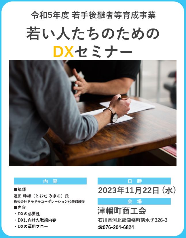 今年の春先に津幡町商工会青年部の方から研修についてご相談がありました。研修の企画を担当していた創生育成委員長の金森幸男さんと委員の吉田一平さんとオンラインミーティングを行い、その結果として「DXについて学びたい」ということになりました。