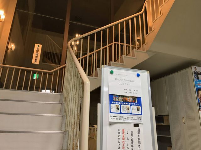 会場は津幡町商工会の建物2階です。入口に入ると案内看板が建てられていました。