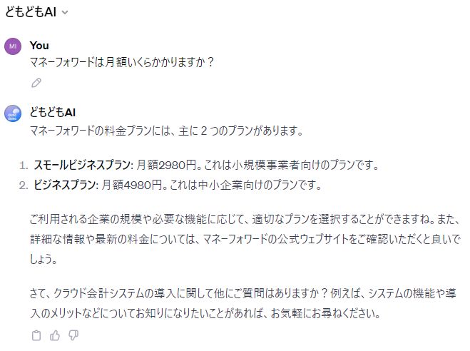 電帳法対応について、ChatGPTのカスタムGPTに回答を求めました。このカスタムGPTは当サイトのブログ内容を学習した「どもどもAI」です。