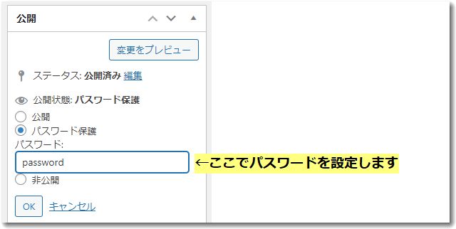 パスワード保護したい投稿の「公開」という設定部分にある「公開状態」のところに「パスワード保護」があります。