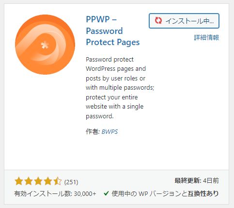 調べてみると「PPWP」というプラグインの評判がよさそうでしたので使ってみました。正式名称は「PPWP – Password Protect Pages」というプラグインです。新規プラグイン追加の画面で検索すると表示されます。