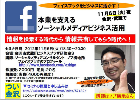 このノブ横地氏を招いて、つい金沢(ツイッター金沢交流会)としてセミナを行なうことにした。セミナタイトルは「本業を支えるソーシャルメディアビジネス活用in金沢」。ツイッターやフェイスブックのビジネス活用に興味がある方にはおすすめ。会場の関係で20名限定になっているので、申し込みは早めに!