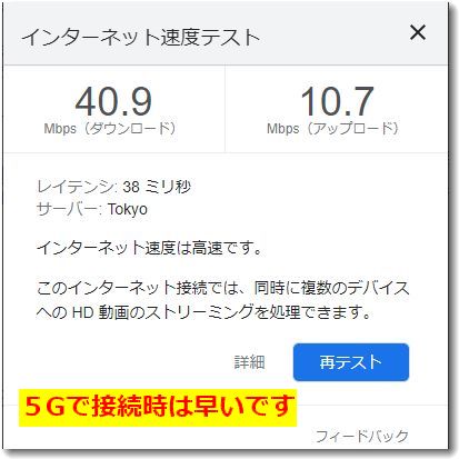 なんと、ダウンロード速度で200Mbps以上の速度がでるとは驚異的です。おどろきました。やはり安定して5G接続できると早いんですね。