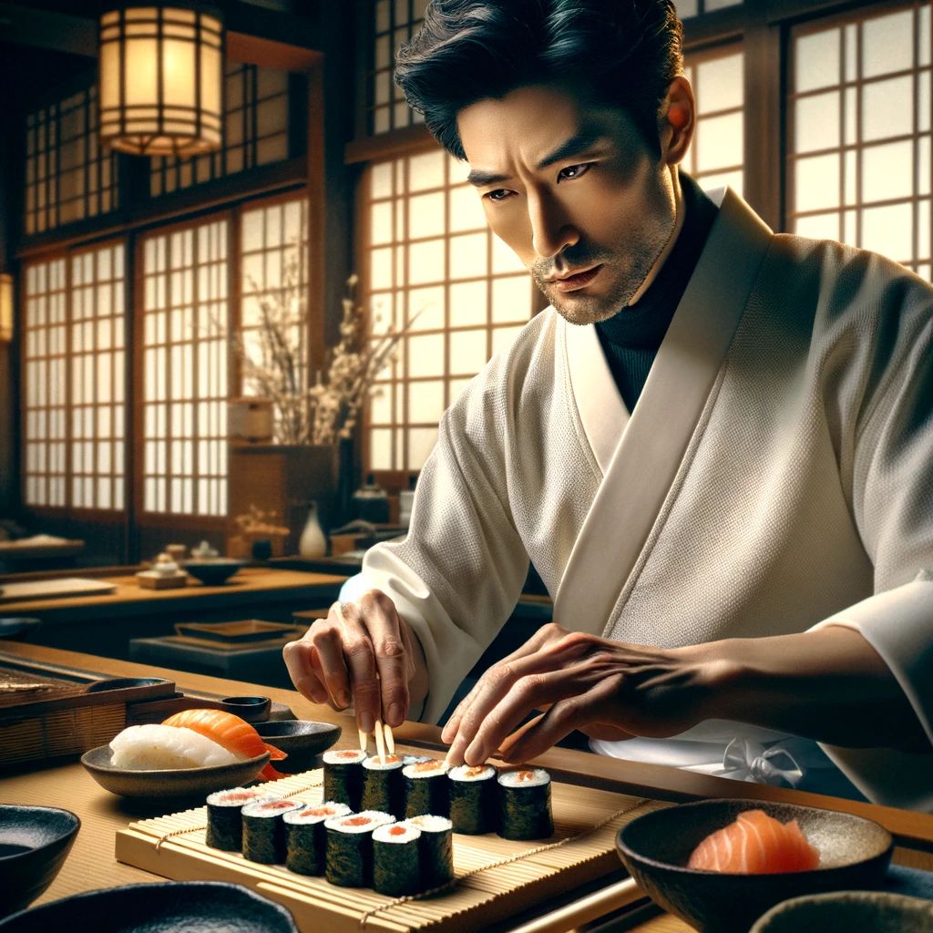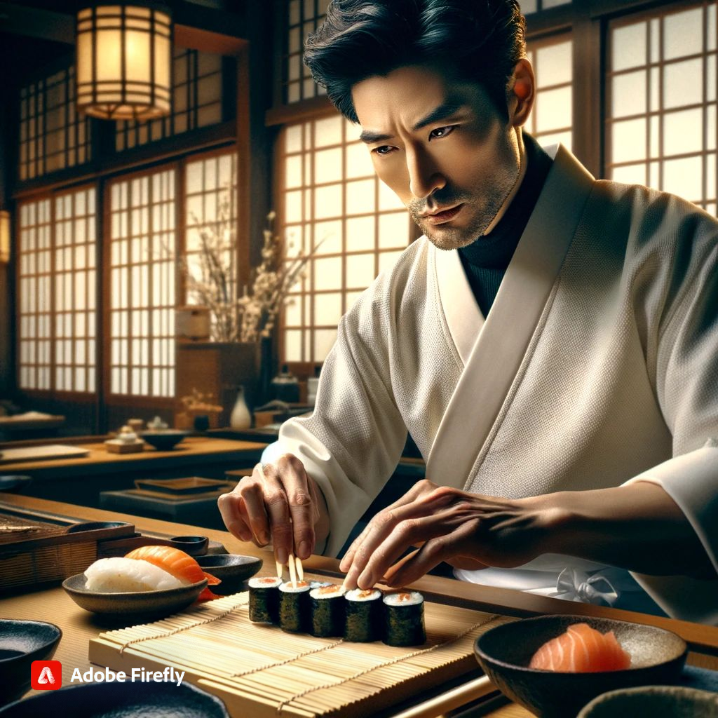 なお、日本人のイケメンマスターが寿司を握っている写真をメインにした画像を生成してください。