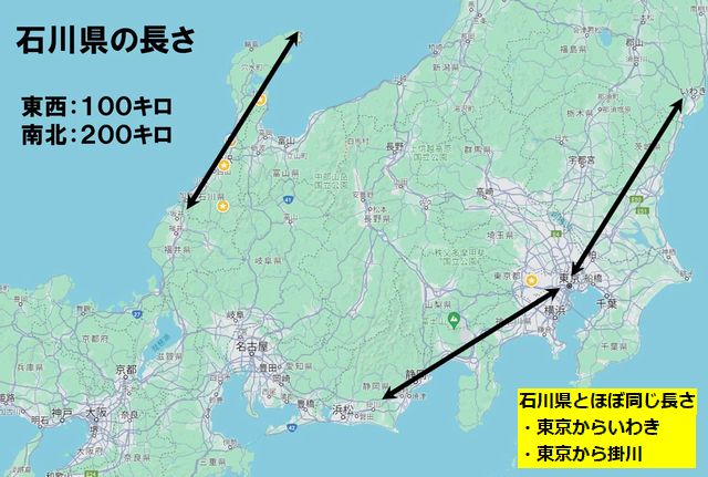 石川県の長さと同じ長さの矢印を東京を中心に貼ってみました。